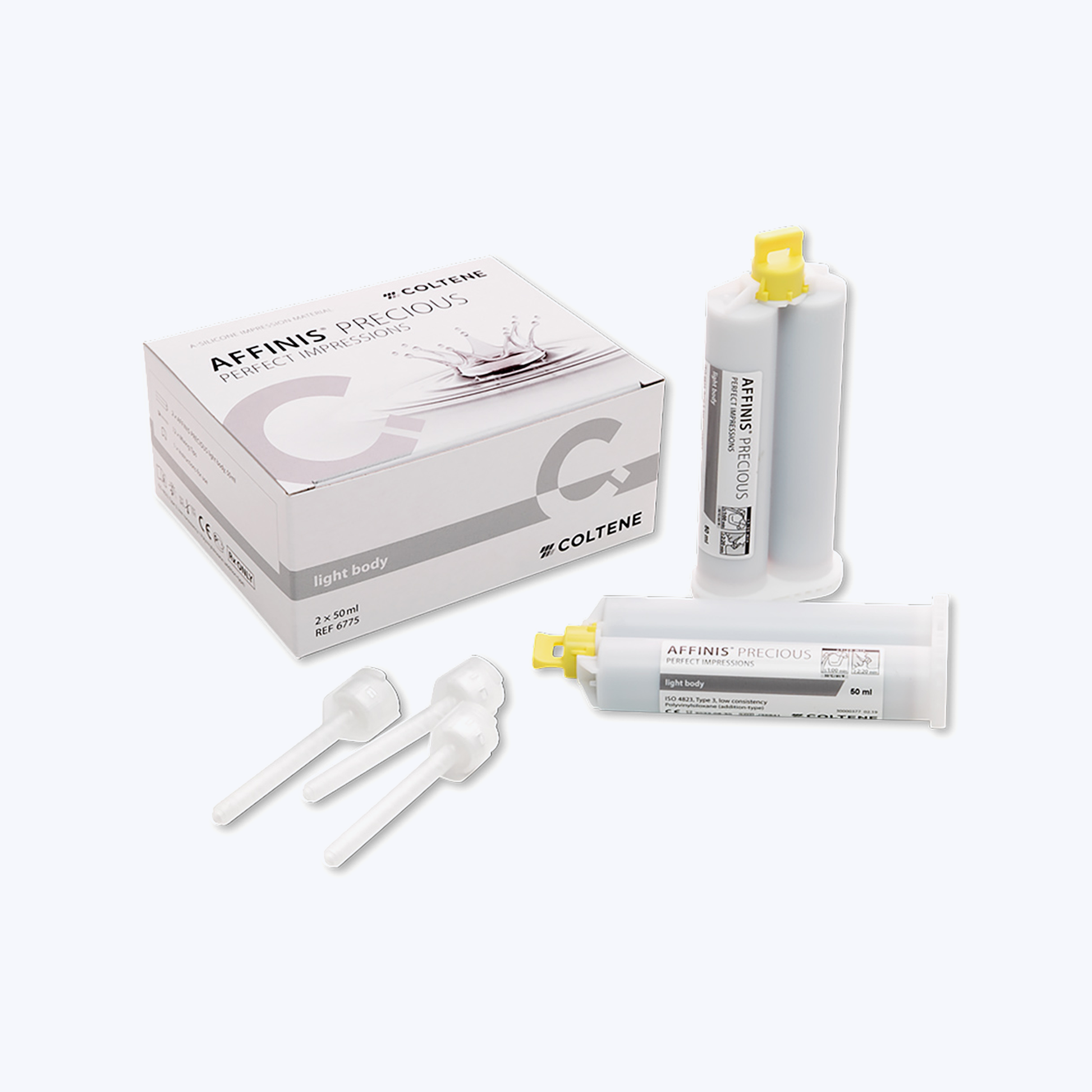 AFFINIS PRECIOUS Light Body is a premium VPS impression material designed for exceptional detail reproduction and precision. Its unique metallic pigmentation (silver or gold) minimizes light scattering, making margins and fine structures highly visible for easy quality control. Ideal for crown and bridge work, this light body material flows precisely and captures intricate anatomy with accuracy.